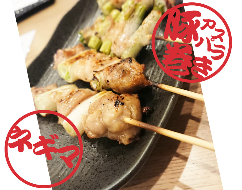 ネギマ 1本87円。豚アスパラ巻き 1本 157円。豚バラ 137円。