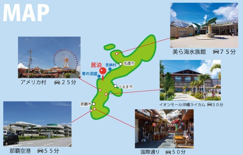 また、お洒落なカフェが多い恩納村や青の洞窟がとても近いのでカフェ好きやダイビング好きにはもってこい!