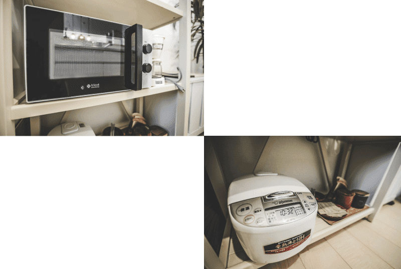 冷蔵庫、電子レンジ、トースター、炊飯器、コーヒーメーカーなどの電化製品はバッチリ揃っています!