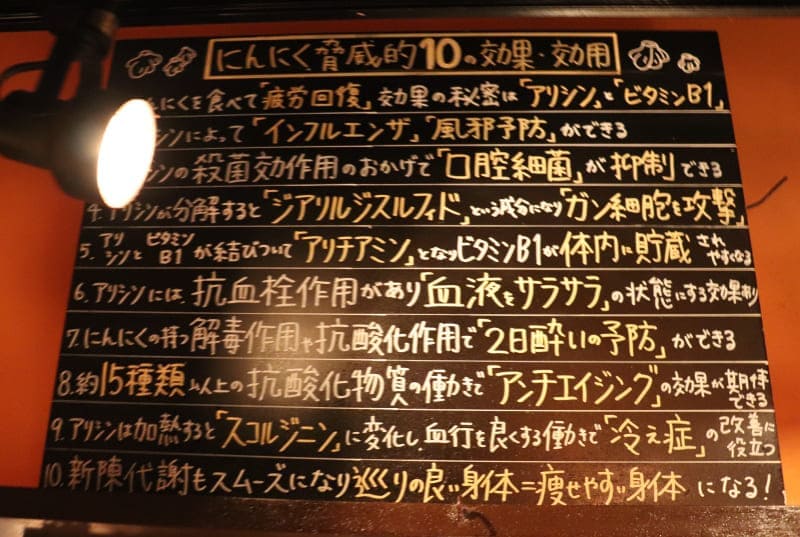 カウンター席頭上には、『ニンニク脅威的10の効果・効用』というプレートが!