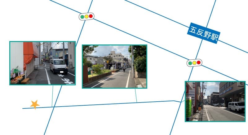 道順:改札口を出て左へ曲がり直進、右手に『ヤオキン株式会社』左手に『サトムラ薬局』が見えましたら、右に曲がり道なりに進む。